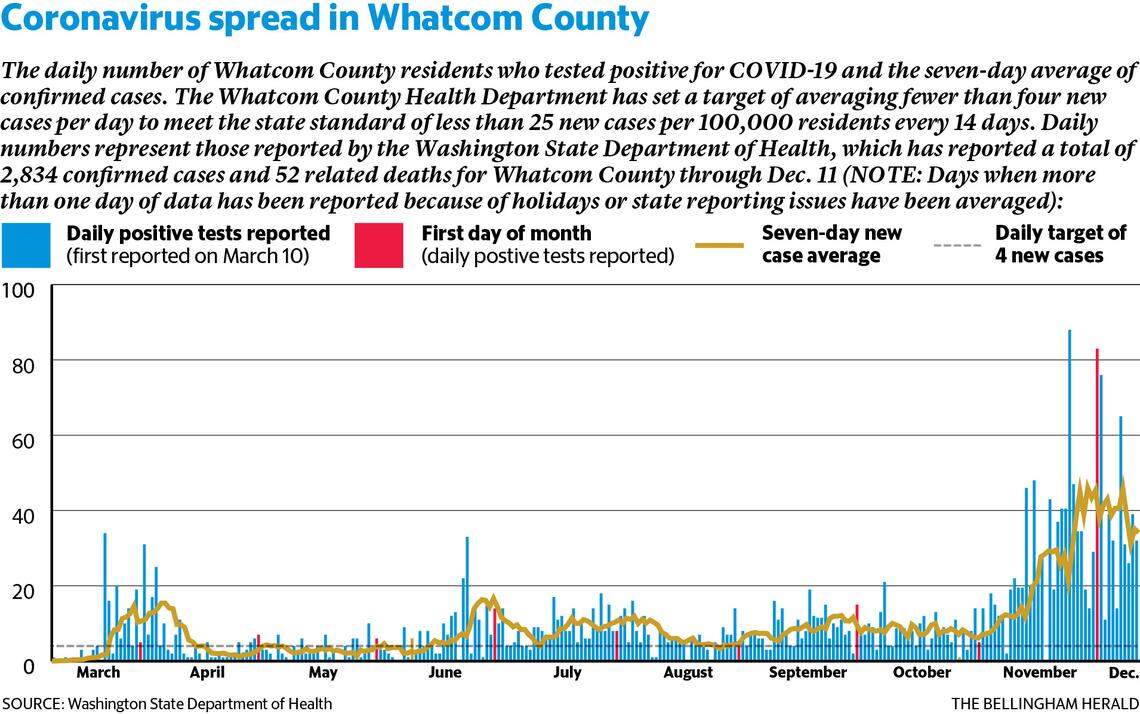 Whatcom County now has seen 2,834 confirmed cases and 52 related deaths during the pandemic, according to state data as of 11:59 p.m. Thursday, Dec. 10. That means that 1.8% of the Whatcom residents who have tested positive for COVID during the pandemic have died.