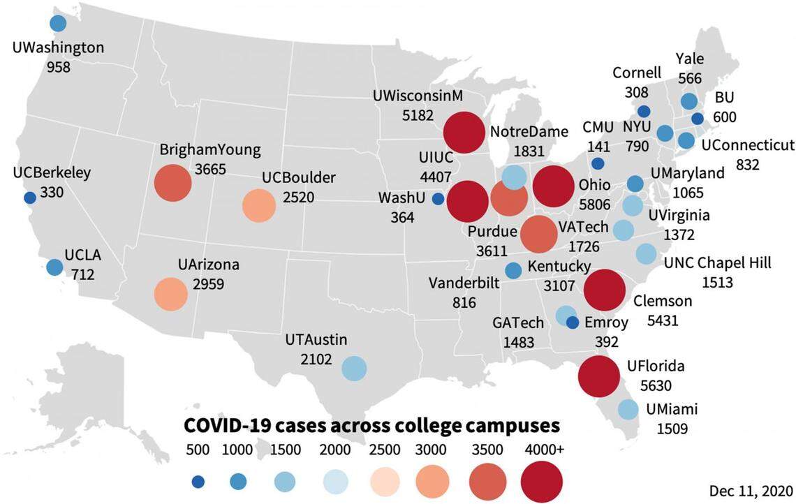 In some colleges, one in five students had contracted COVID-19 by the end of their fall term, which took place between Aug. 15 and Dec. 11. In about half of the schools studied, peak infections that were “well above” 1,000 cases per 100,000 people per week occurred within the first two weeks of class.