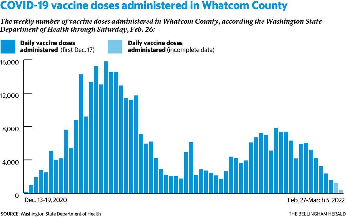 ▪ 368,251 vaccinations administered during the pandemic — up 178 from the last report. The state reports 74.4% of Whatcom County’s total population has initiated vaccination and 68.0% has completed it.