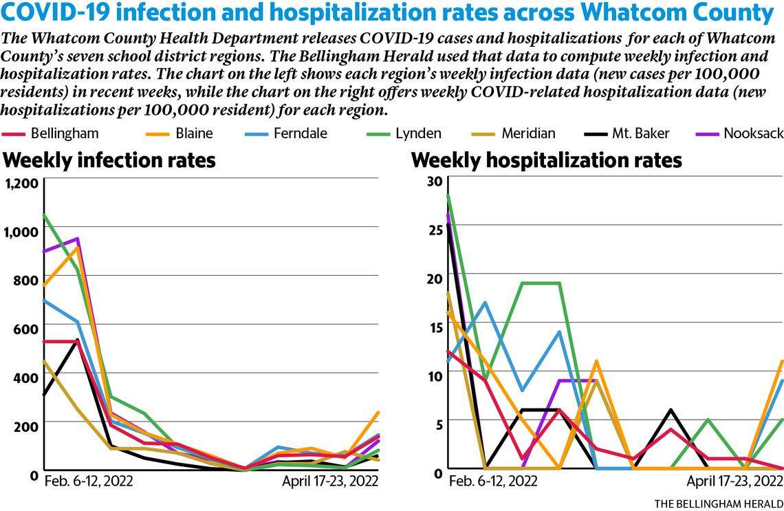 Based on the most recently location data released by the Whatcom County Health Department on Thursday, April 28, and U.S. Census data, The Bellingham Herald’s data analysis found the region covered by the Blaine School District had a weekly COVID-19 infection rate of 237 cases per 100,000 people between April 17 and April 23 and a COVID-related hospitalization rate of 11 new hospitalizations per 100,000 people.