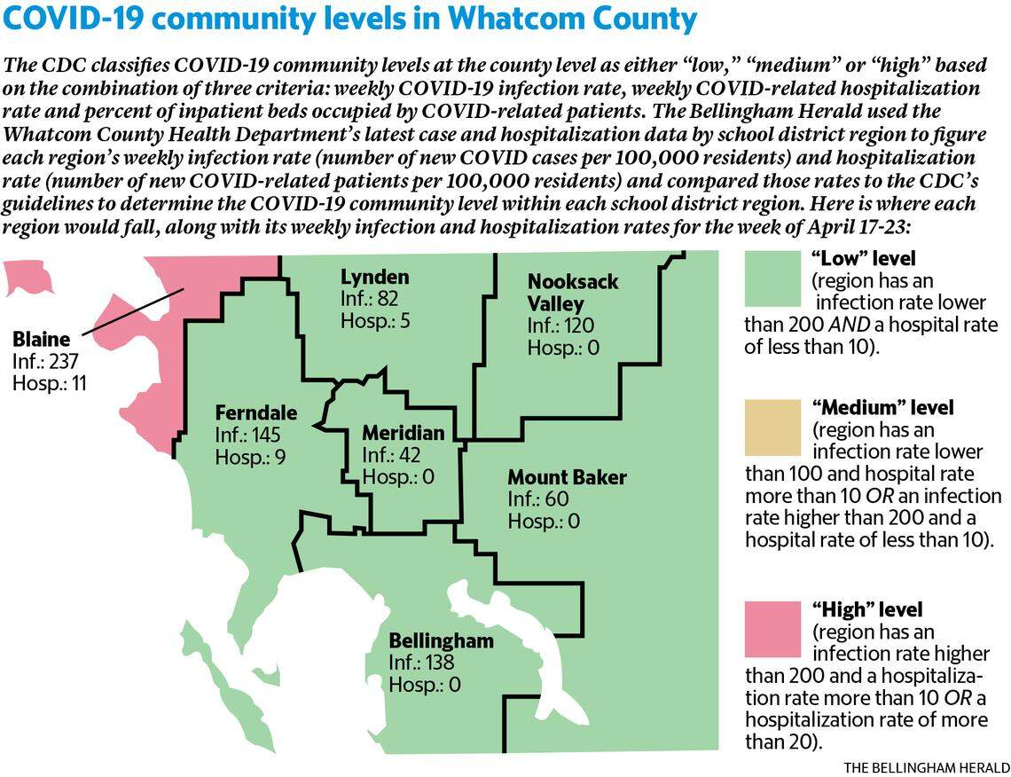 Whatcom’s six other regions all had COVID infection and hospitalization rates within the “low” community level, which is where the CDC had the county, as a whole, rated for a ninth straight week on Thursday, April 28.