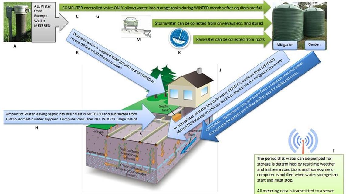 A computer would calculate every 24 hours the amount of water that would need to be mitigated. The water used for mitigation could come from a number of sources, including stormwater from driveways and other surfaces, rainwater and surplus water in the winter.