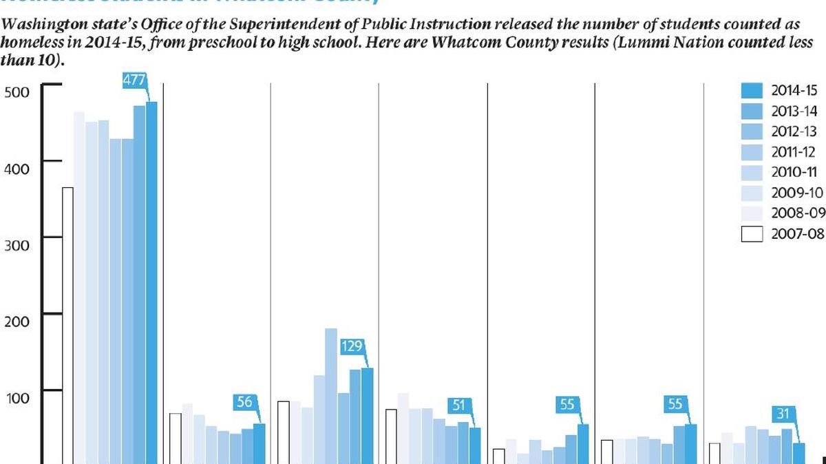 In Bellingham, 477 students from preschool to high school were reported as homeless in 2104-15, virtually unchanged from a year before (471), but a 31 percent increase since the 2007-08 school year.