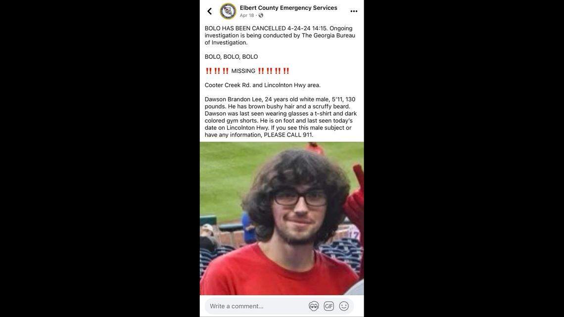 Dawson Brandon Lee, 24, was missing for a week before officers found remains they presume to be his in Elbert County on Wednesday, April 24, authorities said.