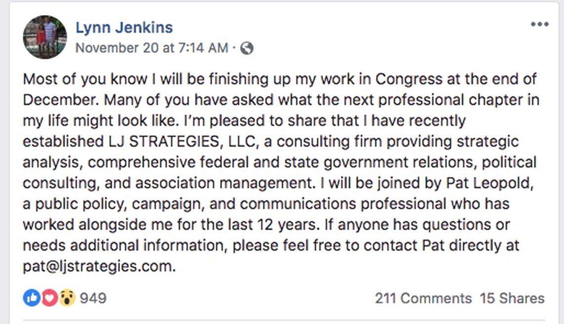 Jenkins’ Nov. 20 post went up the same day LJ Strategies, LLC, was registered with the Kansas Secretary of State’s office by Pat Leopold, her former chief of staff in Washington. The business’ formation was first reported by The Sunflower State Journal.