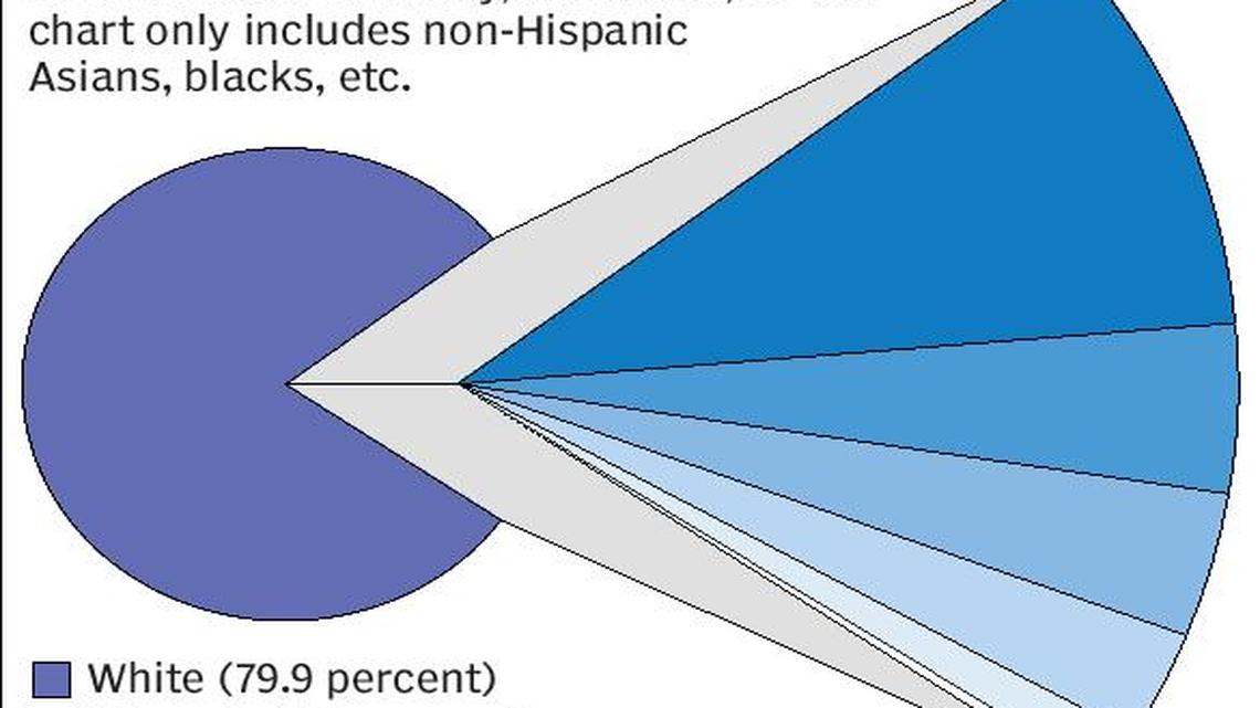 White people who are not Hispanic decreased as a proportion of the total county population, from 81.9 percent in 2010 to 79.9 percent in 2014.